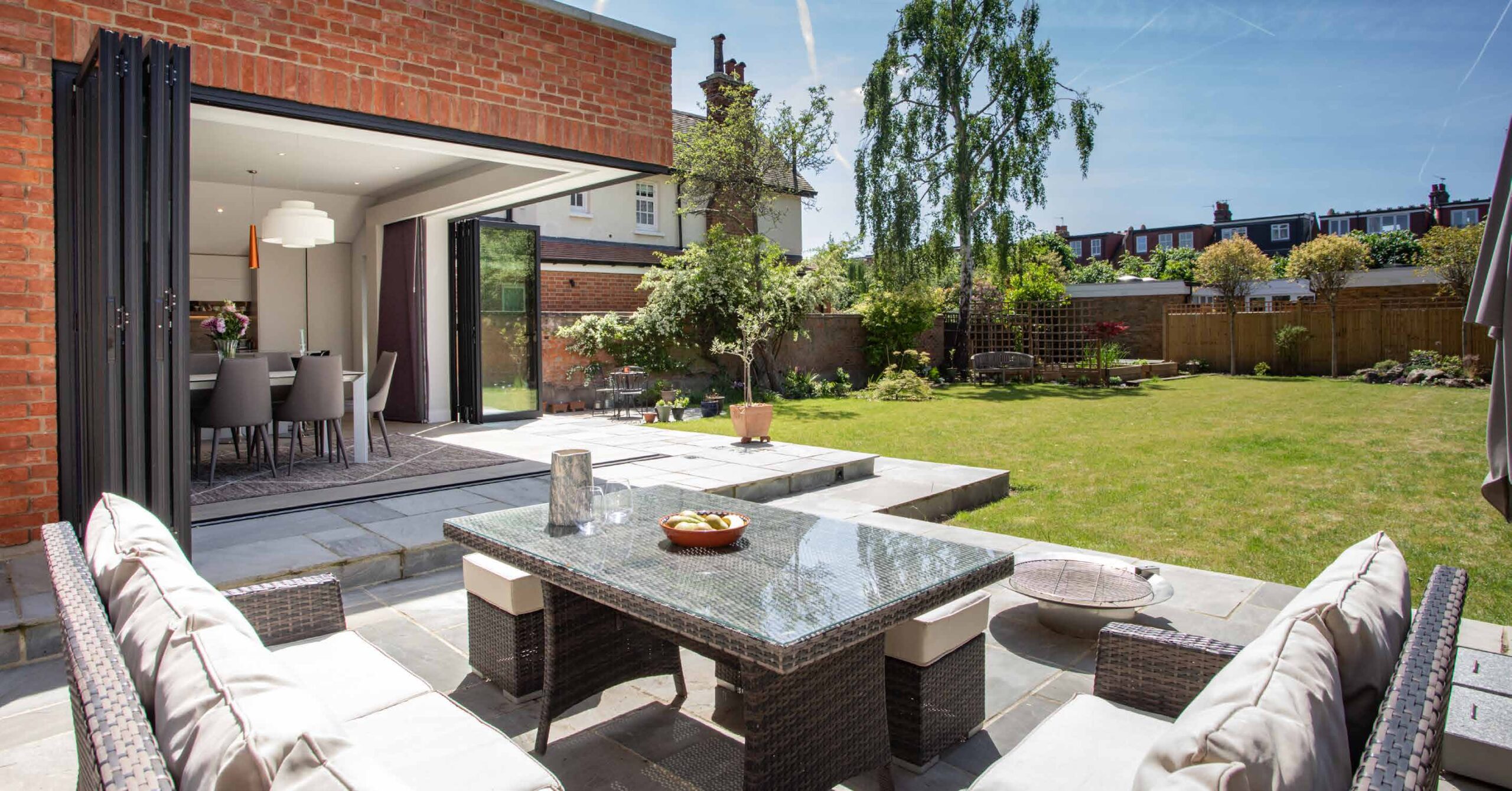 This 3,000sqft property was reconfigured and extended to create a new, contemporary addition to the rear, opening out onto the garden. The corner bi-folding door provided uninterupted views out into the garden as well as the external soft seating area adjacent. Located within the John Innes conservation area, particular
